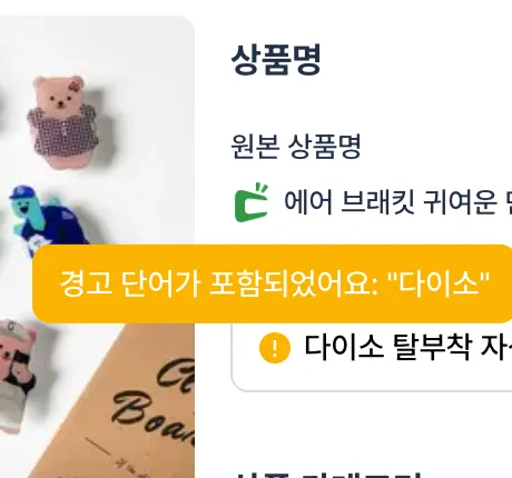 상품 정보에 지재권 문제가 될 만한 단어가 있다면, 윈들리가 실시간으로 미리 알려줘요. 질병명, 상표권 등 수만가지의 단어 사전을 제공하며, 원하는 단어도 직접 추가하여 관리할 수 있어요.