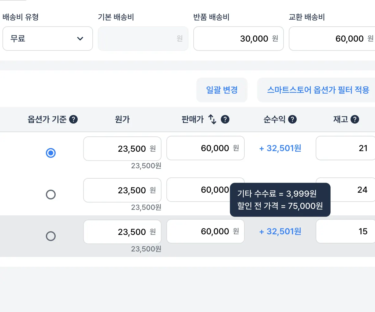 매번 판매가격 계산하거나, 혹시 실수 했을까 걱정하지 마세요. 내가 원하는 마진이나 가격 공식대로 판매가를 자동으로 계산해줘요. 오픈마켓 수수료, 배송비 미포함 설정 등 제대로 하려면 복잡하고 어려운 가격 설정도 윈들리에서는 쉽고 정확하게 할 수 있어요.